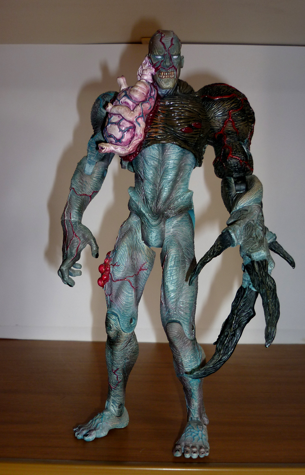 On top of the amazing muscle structure, his skin is textured with lots of wrinkles giving him the look of a corpse. His giant (really in-human GIANT) heart is made with soft plastic and his skeletale visage is really menacing, with the veins covering his face and arms nicelly sculpted.