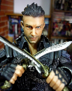 Since his coat is made with hard plastic, this limist a lot the range of movement on his legs and the collar of the same coat limit a lot the articulation on his head as well. Many parts of the figure are made with soft plastic (like the silks, the shoulder pads, the reptilian skin) but he is made mustly with hard plastic. This makes him feels very high quality and makes him heavy, but in this case it trully block his movement range a lot.